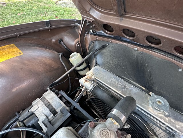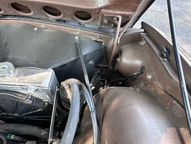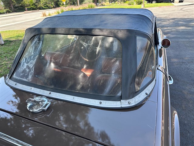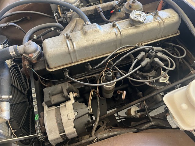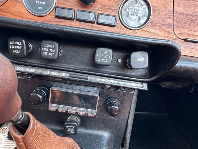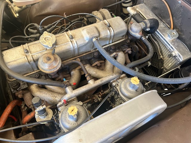 The interior has been nicely refinished with tan leather bucket seats and matching door panels, as well as a restored wood dash and Moto-Lita three-spoke wood-rimmed steering wheel that give the classic feel from the driver’s seat one would expect of this kind of roadster. A full set of Smiths gauges all work properly and a retro-style AM/FM radio with Bluetooth compatibility has been added to bring a touch of modern sophistication to this classic.
